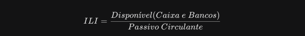 O ILI é a prova de fogo do seu caixa. Ele mostra a capacidade de a empresa pagar suas dívidas de curtíssimo prazo sem depender de receber de clientes ou vender estoques (unidades prontas).